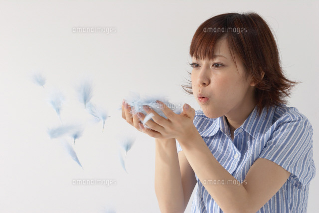 羽根を吹き飛ばす女性 の写真素材 イラスト素材 アマナイメージズ